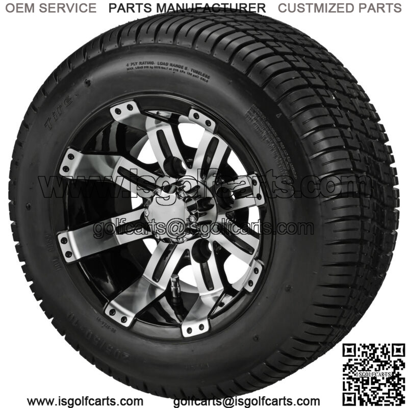 This 10″ golf cart tire & wheel is an example of the huge selection of golf cart wheels and tires available from RM Cart. This black & machined wheel offers the right amount of bling for your cart. The 205/50-10 tire will fit on most any standard golf cart.