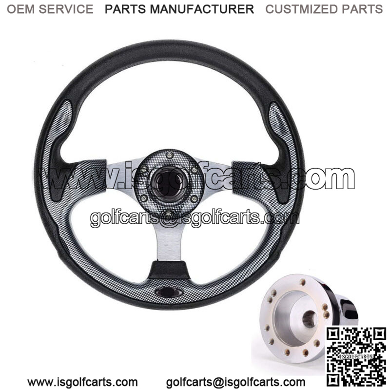 12.5inch Golf Cart Steering Wheel with 5/6 Hole Hub Adapter for EZGO TXT RXV- Golf Cart Steering wheel and Chrome Hub adapter fit EZGO TXT RXV golf cart.- Has hard aluminum spokes and Lightweight body made of PVC, 12.5 inches diameter steering wheel, A good choice to replace your old steering wheel.- Steering wheel adapters have high hardness, corrosion resistance and high temperature resistance, Made Of Electroplated Aluminum Alloy.- Easy to Install: in minutes with 5/6 hole steering wheel adapter, drilled for 5 and 6 hole steering wheels.- The decor of this golf cart steering wheel is inspired by professional racing cars. By replacing this steering wheel with its nice racing style look, your golf cart will look new and stand out on the street!- It brings a comfortable feel through the rounded and smooth grip that fits the curve of the human palm, so that your hands do not get tired of driving for a long time.- Package includes: 1x Carbon fiber Steering Wheel + 1 x 5/6 hole Chrome Hub Adapter for EZGO