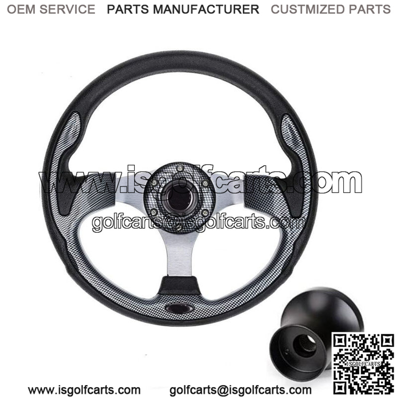 12.5inch Golf Cart Steering Wheel with Black Hub Adapter for Club Car DS Carts- 12.5″ Carbon fiber golf cart steering wheel and Black 5/6 hole steering wheel adapter fits Club Car DS only;- The decor of this golf cart steering wheel is inspired by professional racing cars. By replacing this steering wheel with its nice racing style look, your golf cart will look new and stand out on the street.- Golf Cart Steering wheel brings a comfortable feel through the rounded and smooth grip that fits the curve of the human palm, so that your hands do not get tired of driving for a long time.- Golf Cart Steering wheel has hard aluminum spokes and Lightweight body made of PVC, wear-resistant, corrosion-resistant and 1-year warranty, which makes it last longer.- Easy to install: Come with upgraded nuts and wrench for 5 minutes quick installing this golf cart steering wheel and Club Car DS Black hub adapter. – Package: 1x Steering Wheel + 1 x 5/6 hole Steering Wheel Hub Adapter for Club Car DS.