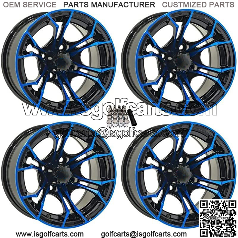 This Wheel and Tire Kit Includes:(4) GTW Spyder 12×7 Golf Cart Wheels – Gloss Black/Blue (4/4) 3+4 [19-220] (1) RuggedPRO Chrome Lug Kit & Valve Stems – 12mm x 1.25″ [Beveled] NOTES:If you have any questions or concerns about fitment please contact us by email or phone BEFORE you order.When you buy a set of 4 wheels OR 4 wheels & tires from us we include a Chrome Lug Kit at no additional charge ($20 Savings).Beware of other companies that do not include lug nuts & valve stems with their wheel sale, some wheels require a special type of lug nut to fit into the wheel and your stock lug nuts may not work.If you wish to substitute the Chrome Lug Kit with a Black Lug Kit please contact us prior to ordering to verify availability and to ensure the change is made before the product has been packaged/shipped.We stock the majority of what we sell to ensure you get a great price and your order is shipped in a timely fashion.If you are interested in a mounted setup and don’t see what you are looking for on our store please let us know. We can always package any tire we offer on any wheel we offer and they will come to your door mounted and ready to bolt on to your machine.