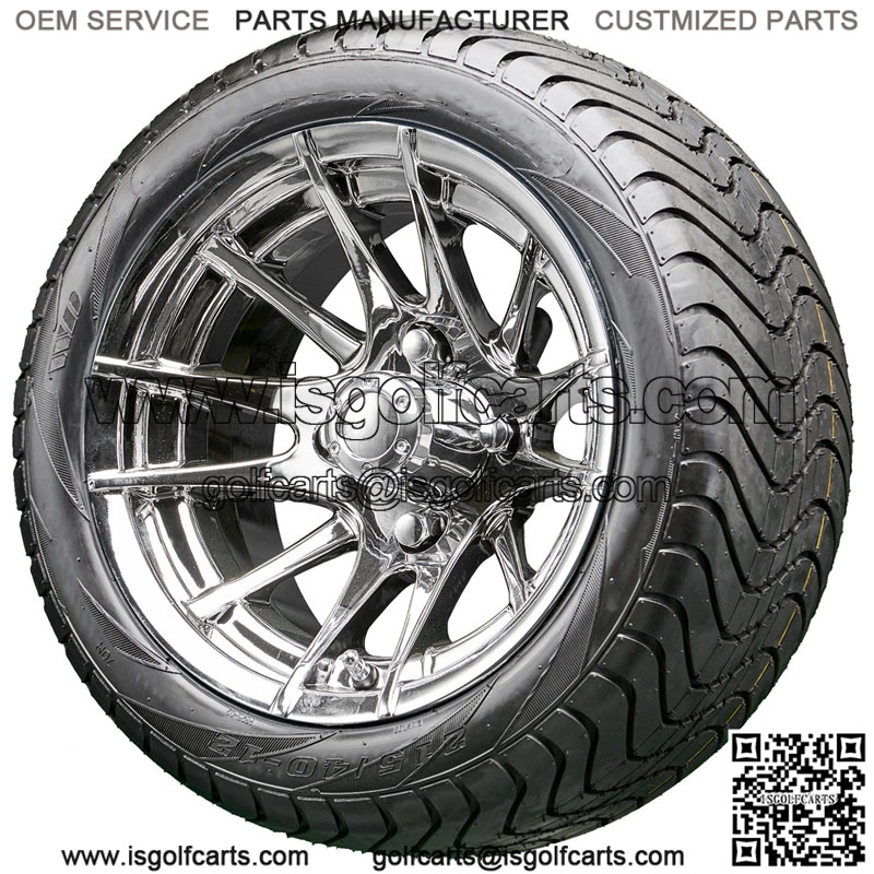 12” RX102 Chrome Wheels on your choice of Street Low Profile Tires Details: Set of 4 mounted golf cart tire and wheel assemblies 16 Chrome Lug Nuts 4 Center Caps Chrome RX102 Wheels 12×7 with 4×4 bolt pattern and ET-25 offset This combo will NOT require a lifted cart Tire Options: TIR-345 215/40-12 DOT 4 Ply TIR-372 215/35-12 DOT 4 Ply [$15] TIR-344 215/50-12 DOT 4 Ply [$30] TIR-342 225/55-B12 DOT 4 Ply [$75] 215/35-12 = 17.9″ Tall – 8.5″ Wide (fits all models) 215/40-12 = 18.5″ Tall – 8.5″ Wide (fits all models) 215/50-12 = 20.5″ Tall – 8.5″ Wide (fits RXV/TXT/Yamaha Drive without a lift) 215/55-B12 = 21″ Tall – 9.0″ Wide (fits RXV/Yamaha Drive without a lift) *Please select Standard (and Club Car) or Metric (Yamaha) Lug Nuts*