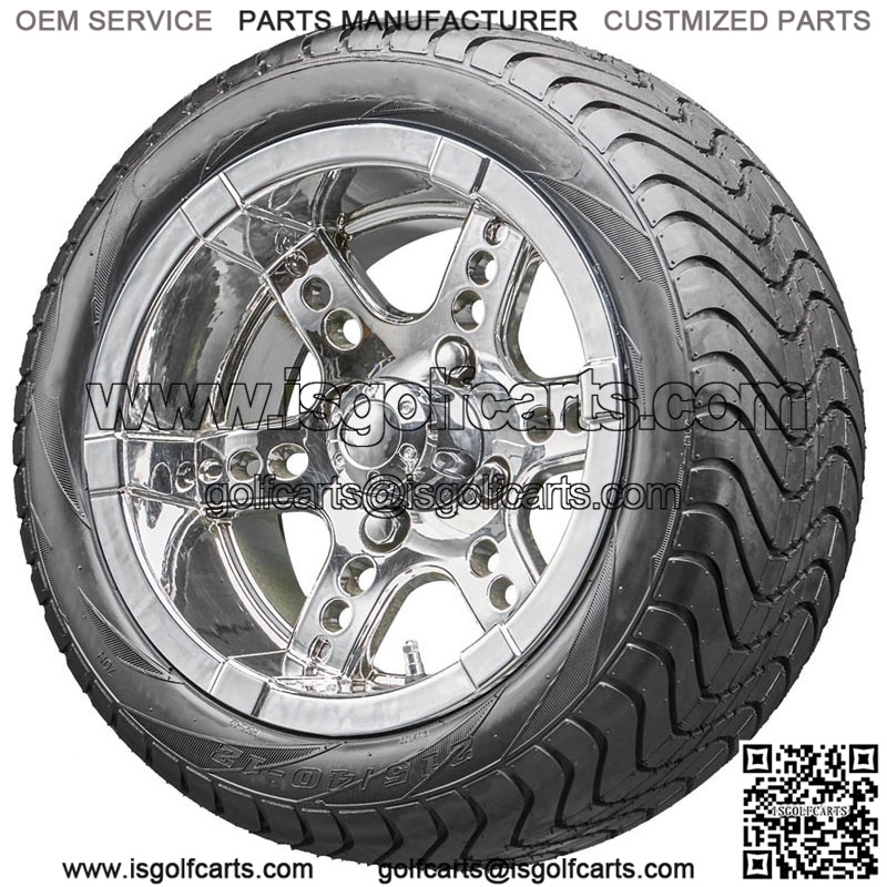 12” RX254 Chrome Wheels on your choice of Street Low Profile Tires Details: Set of 4 mounted golf cart tire and wheel assemblies 16 Chrome Lug Nuts 4 Center Caps Chrome RX254 Wheels 12×7 with 4×4 bolt pattern and ET-25 offset This combo will NOT require a lifted cart Tire Options: TIR-345 215/40-12 DOT 4 Ply TIR-372 215/35-12 DOT 4 Ply [$15] TIR-344 215/50-12 DOT 4 Ply [$30] TIR-342 225/55-B12 DOT 4 Ply [$75] 215/35-12 = 17.9″ Tall – 8.5″ Wide (fits all models) 215/40-12 = 18.5″ Tall – 8.5″ Wide (fits all models) 215/50-12 = 20.5″ Tall – 8.5″ Wide (fits RXV/TXT/Yamaha Drive without a lift) 215/55-B12 = 21″ Tall – 9.0″ Wide (fits RXV/Yamaha Drive without a lift) *Please select Standard (and Club Car) or Metric (Yamaha) Lug Nuts*