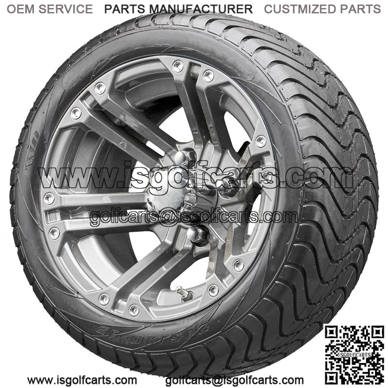 12” RX335 Gun Metal Gray Wheels on your choice of Street Low Profile Tires Details: Set of 4 mounted golf cart tire and wheel assemblies 16 Chrome Lug Nuts 4 Center Caps Gun Metal Gray RX335 Wheels 12×7 with 4×4 bolt pattern and ET-25 offset This combo will NOT require a lifted cart Tire Options: TIR-345 215/40-12 DOT 4 Ply TIR-372 215/35-12 DOT 4 Ply [$15] TIR-344 215/50-12 DOT 4 Ply [$30] TIR-342 225/55-B12 DOT 4 Ply [$75] 215/35-12 = 17.9″ Tall – 8.5″ Wide (fits all models) 215/40-12 = 18.5″ Tall – 8.5″ Wide (fits all models) 215/50-12 = 20.5″ Tall – 8.5″ Wide (fits RXV/TXT/Yamaha Drive without a lift) 225/55-B12 = 21.7″ Tall – 9.0″ Wide (fits RXV/Yamaha Drive without a lift) *Please select Standard (and Club Car) or Metric (Yamaha) Lug Nuts*