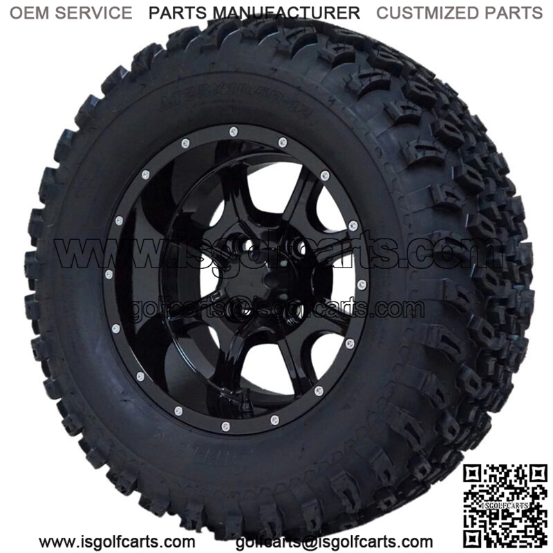 item descriptionSteeleng Stalker Golf Cart 12″ Gloss Black Lifted Wheel and Tire Combo Set – BRAND NEW Complete Set of 4 Steeleng 23″ All Terrain Tires Mounted on 12×7 Stalker Gloss Black Aluminum Wheels- High Quality Aluminum Alloy Wheels with Standard 4×4 Bolt Pattern- Fits Great on Any Model Golf Cart with a 5″ or 6″ Lift Kit- All Tires and Wheels Ship Fully Mounted and Inflated Ready for Installation Includes:(4) 23X10.5-12 Steeleng All Terrain Tires (4) 12X7 Steeleng Stalker Gloss Black Aluminum Wheels with +1″ Offset(4) Black SS Center Caps(16) Black Lug Nuts (See Note Below)- Please let us know if you have a Yamaha Golf Cart and we will ship Metric Lug Nuts, otherwise Standard Lug Nuts will be shipped –