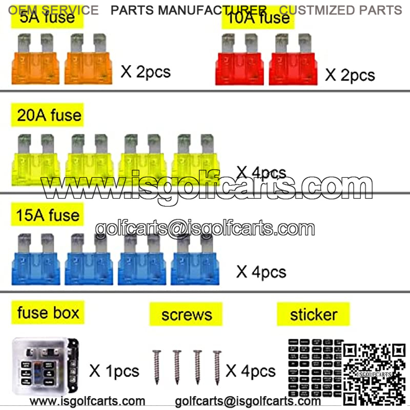 1 x 6 Circuit Fuse Block w/ Neg Bus2 x 5A orange fuse pieces2 x 10A red fuse pieces4 x 15A blue fuse pieces4 x 20A yellow fuse pieces2 x sticker4 x screws