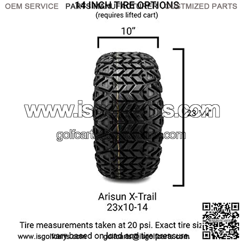 14″ Bomber Matte Gunmetal – Lifted Tires and Wheels Combo.Details: Set of 4 mounted golf cart tires and wheel assemblies.16 Optional Black Lug Nuts and 4 Center Caps.Bomber Matte Gunmetal Wheels 14×7 with 4×4 bolt patternMust have a lift kit of 6″ or higher.This combo will NOT fit on non-lifted carts.ET -25 offsetTire Options: 23×10-14 X-Trail All-Terrain