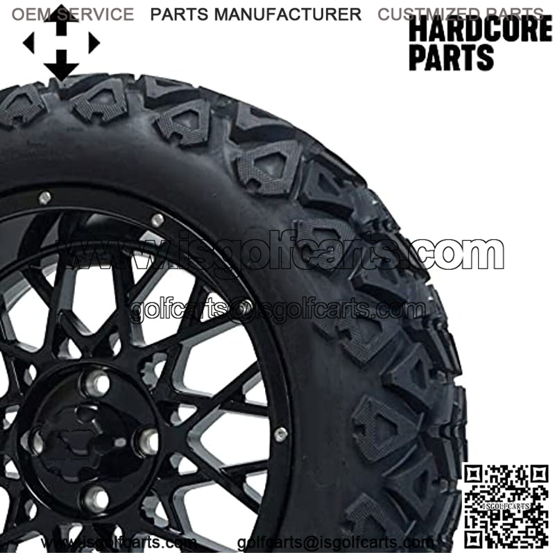 Transform the look and performance of your golf cart with this complete set of 4 (2 Front & 2 Rear) 15″ Black wheels with mounted tires, center caps and lug nuts. This set includes 4 Black ‘SS’ center caps and 16 Black 1/2×20 lug nuts.Fits: All Golf Carts, ATV/UTVs, Mowers and Trailers with a 4×4 (101.6mm) bolt pattern and 1/2×20 Thread Pitch. Before purchasing, please check that your cart is compatible with the Standard (1/2×20) Lug Nuts included with this kit. All Yamaha & Star EV carts require METRIC Lug Nuts (M12x1.25)!Please Note: These tires fit Lifted carts (4″-6″) only. For other vehicles, larger tires may require a lift kit. Please check that the tires included with this kit are compatible with your vehicle.Wheel Specifications: