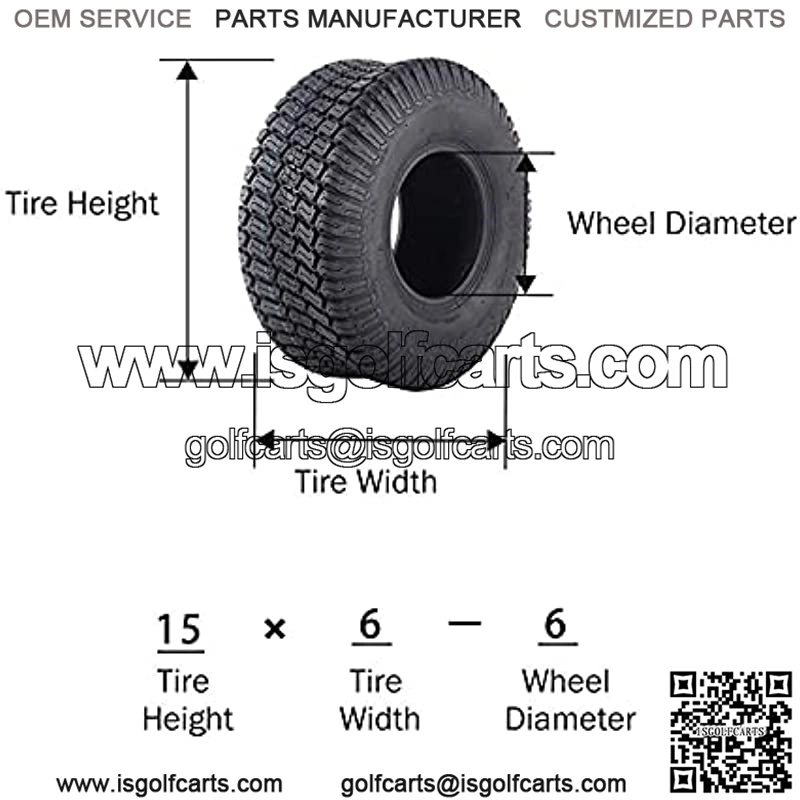 Tire size: 15/6-6. Tread Depth: 0.23″/6mm. Rim Width: 4.50″. SW:6.29″. OD:14.96″. Max Load: 570 lbs@30PSI. Type: Tubeless Made with high grade rubber material in exquisite workmanship, ensures ultra quality and reliability. Heavy 4 Ply Rated nylon construction resists punctures and abrasions Featuring closely packed tread blocks that provide great traction and balance. Wide Shoulder design provides minimum damage to your equipment, turf and lawn Multipurpose turf friendly design for lawn & garden utility vehicles or golf carts. 2 pcs Tubeless tires ONLY, rims are NOT included NOTE: Certificate of DOT compliance number: R3. And NOT FOR HIGH WAY SERVICE, tire speed cannot exceed 80 km/h