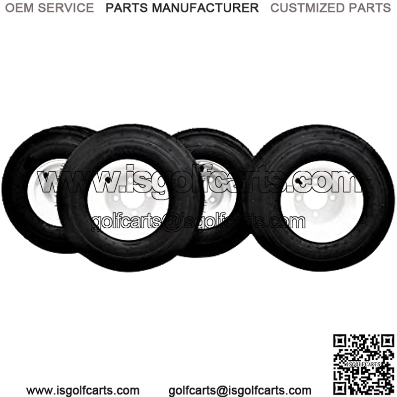 Set of 4 Tire and Wheel Assemblies *** Wheel Color: White *** Wheel Size: 8×7 *** Pilot Hole: 2.83″ *** Number of Bolt Holes: 4 *** Bolt Hole Size: .590″ *** Bolt Circle: 4″ *** Offset: Centered *** Tire Size: 18×8.50-8 *** 4 Ply *** Tread Code: ATW-009 *** Non-Directional *** Tire OD: 17.72 Nom *** Tire SW: 8.46 Nom *** PSI: 22 *** Load Rating at 10 mph: 815 lbs.. Fits all Golf Carts.