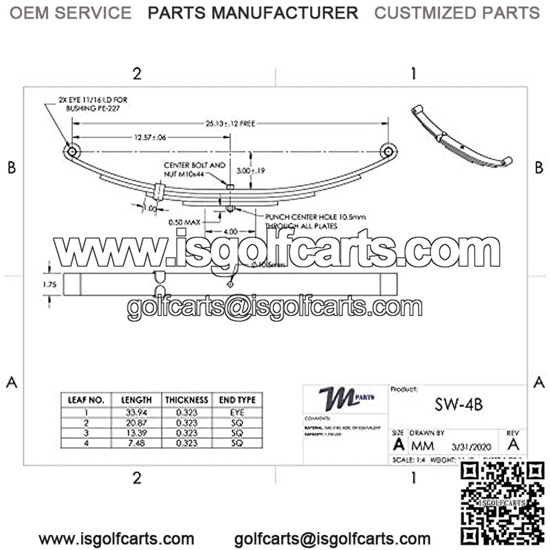 SW4B Trailer Spring – 25-1/4″ Double Eye 4-Leaf Spring 1-3/4″ Wide for 3,500 lbs (3.5K) Trailers (1750 lb Capacity Per Spring)
