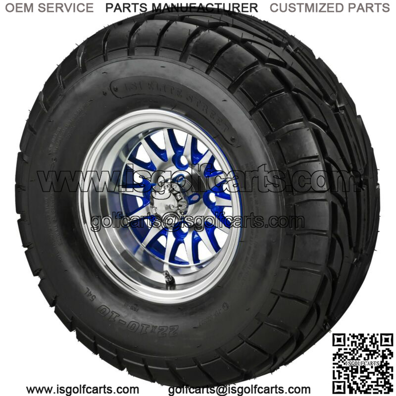 4 Golf Cart 22×10-10 Street Tires on 10×7 Machined/Blue 14-Spoke Wheels