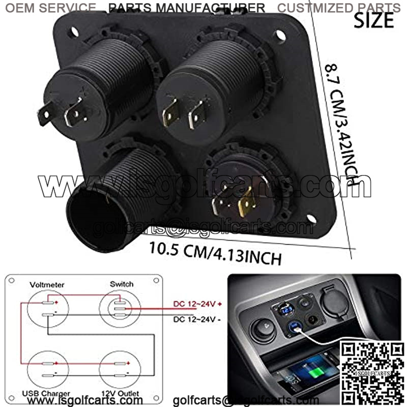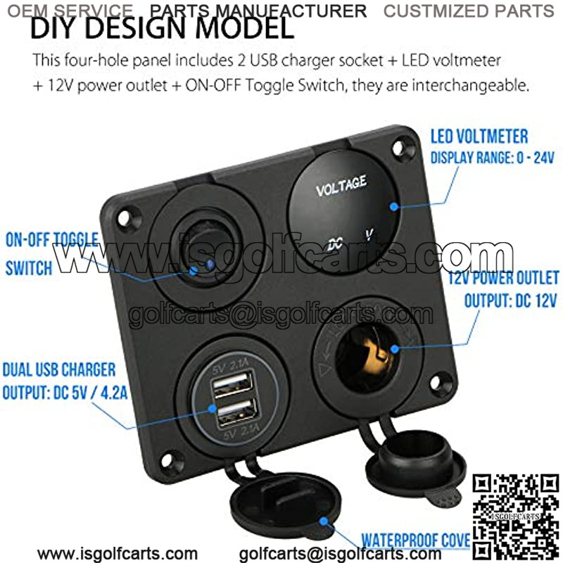 4 in 1 MULTIFUNCTION PANEL: This four-hole panel includes dual USB charger socket (Output: DC 5V/4.2A) + LED voltmeter (Display range: 0-24V) + 12V power outlet (Output: DC 12V) + ON-OFF Toggle Switch. They’re interchangeable, and also can be replaced with any port with additional USB outlets, or anything else that fits
