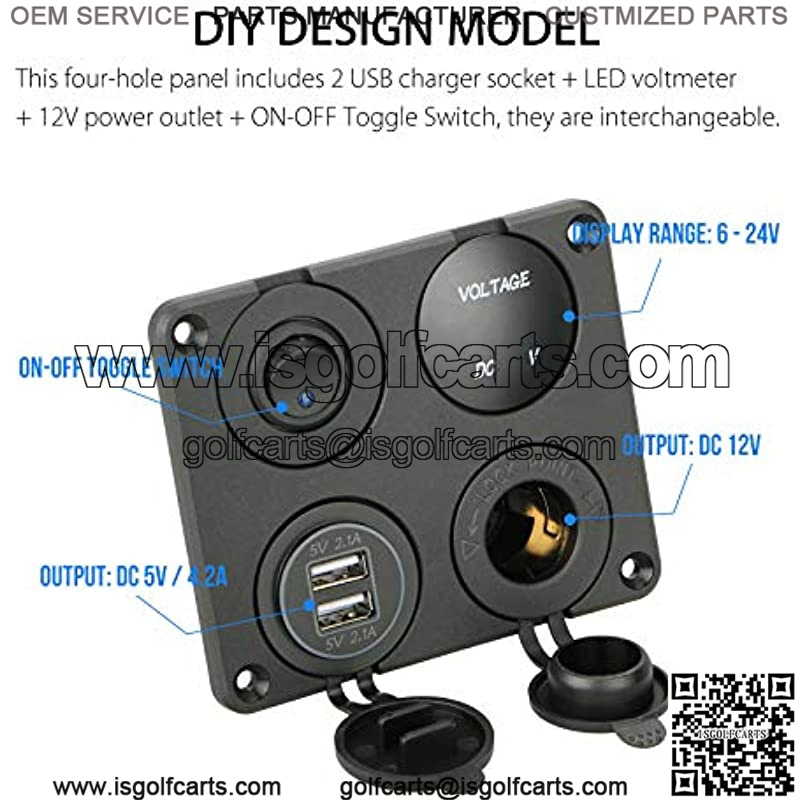 4 IN 1 DESIGN: This four-hole panel includes 2 USB charger socket (Output: DC 5V/4.2A) + LED voltmeter (Display range: 6-24V) + 12V power outlet (Output: DC 12V) + ON-OFF Toggle Switch, they are interchangeable. You also can replace any port with additional USB outlets, or anything else that fits