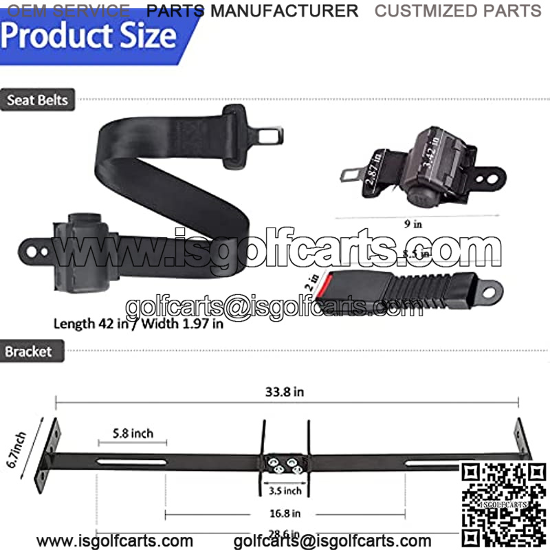 Features and Benefits: With seat belts kit, there are no drilling holes needed. Designed to work on front and rear seat without multiple brackets. 42 inch long retractable Belt length can fit most users well. Easily buckle and unbuckle design, more flexible and sturdy. Upgraded 3 holes Black iron sheets design suits for more golf carts.