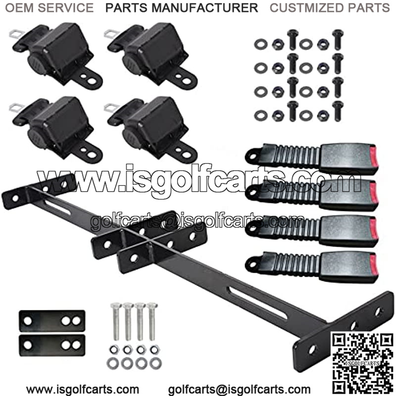 Retractable Golf Cart Seat Belts and Bracket Kit includes 1 bracket & 4 seat belts with buckles, designed to work on front & rear seats without multiple brackets, reducing passengers from falling out accidentally