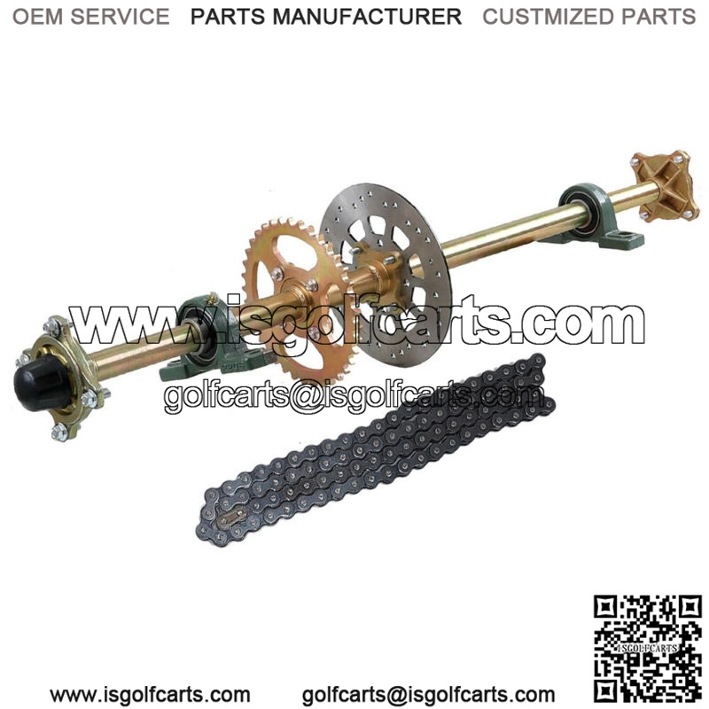 Description: This is a live axle kit for DIY rebuild Go Kart, ATV, Quad and Drift Trikes.Specification: Type: Rear Axle KitAxle Overall length (from end to end): 1140mm (44.8″)The thickest part of the axle is 33mm (1.3″)Chain Sprocket: 530 37 Tooth 58mmBrake Disc Diameter: 220mm(8.66″)Spline teeth: 24TOther Dimensions: As pictures shownNote: Installation Instructions is not included. Professional installation is recommended.Package includes: Rear Axle + Pair of pillow blocks + Sprocket + Brake Disc + Pair of 4 bolt wheel hubs (As Picture Shown)