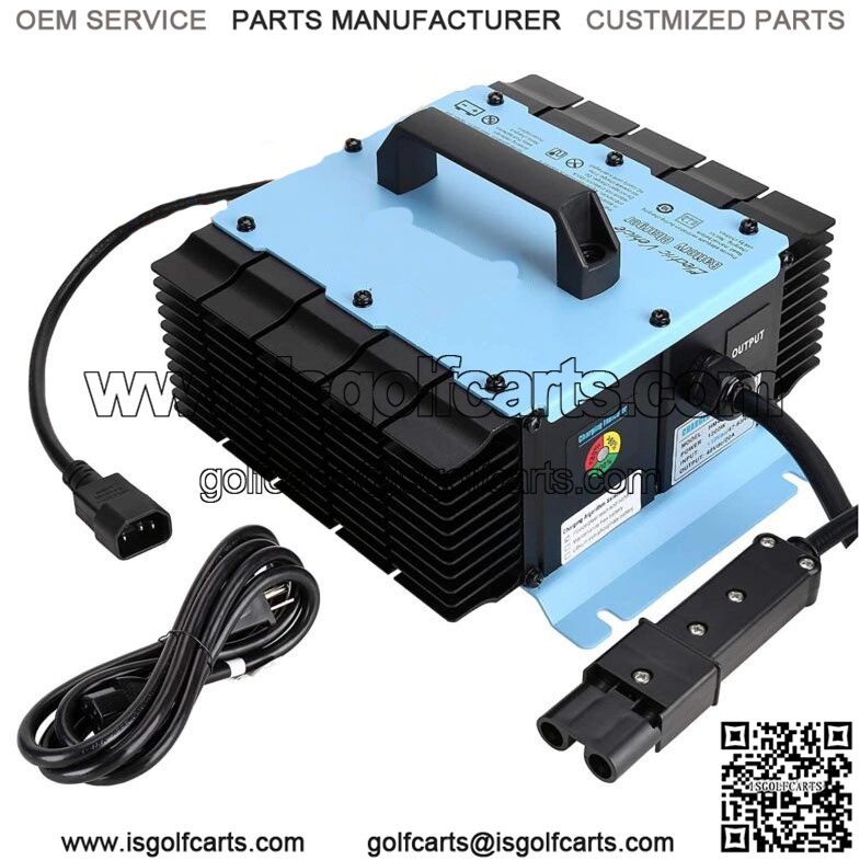 48V 18A Golf Cart Battery Charger for Yamaha G19 G22 with 2-Pin Plug- Golf cart battery charger includes a Powerwise plug for fast and easy charging of all 48 Volt Yamaha G19 G22 golf carts.- Yamaha G19 G22 battery charger made in high-quality aluminum shell to make this Yamaha battery charger golf cart sturdy and durable to use;- Golf cart battery charger main protections: over-temperature protection, short- circuit protection,over-voltage protection, Timing shutdown protection, reverse polarity protection;Intelligent MCU Control Charging: The product can automatically realize multi-stage charging: constant current, constant voltage, etc. – Three charging algorithm can be selected according to the type of battery: 1)Flooded/wet Lead-acid Battery; 2)Maintenance Free Battery; 3)Lithium Iron Phosphate Battery.(PLS NOTE: Confirm the BATTERY TYPE before use);- Yamaha golf cart battery charger with international standard IT chip can ensure your fast charge, and it can achieve high output st