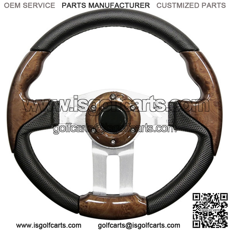 13″ Diameter Custom Steering Wheel. Style: 5. Color: Woodgrain Grip with Brushed Aluminum Spokes. Easy installation on E-Z-Go, Club Car and Yamaha with Custom Adapter (sold separately). Horn button is for aesthetic purposes only. Add a Chrome Adapter (Optional – $25)