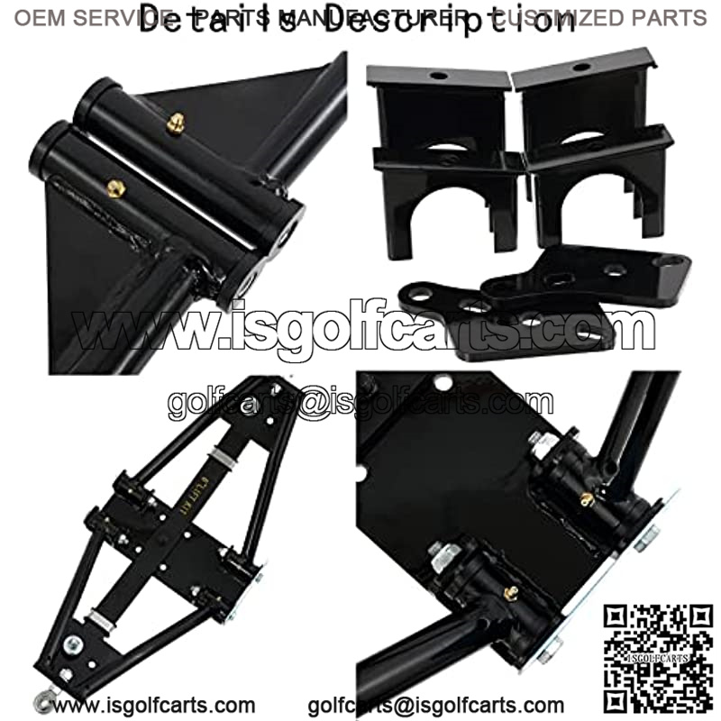 This kit is designed to provide 6 inches of smooth ride on 2004 and Up Club Car Precedent electric or gas models. Easy to follow including complete instructions. No-cut and no-weld design for easy bolt-on installation. 6″ lift allows tires up to 23″ high Replaced stock front axle with A-arm design. High gloss durable black powder coat Durable polyurethane bushing Comes with matching screwsOur delivery time is 3~5 days.