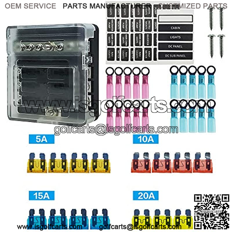 ??[Package Includes]: 6 Way Fuse Block with insulation cover*1,20A Fuse*4, 15A Fuse*4, 10A Fuse*4, 5A Fuse*4, Terminal*20,Labels*4, Screws*4