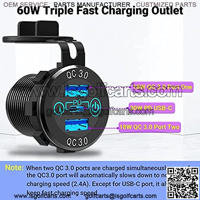 60W USB C Car Charger Socket, Ouffun Aluminum Metal 12V/24V Multiple USB Outlet 30W PD USB-C & Two QC3.0 Ports with Power Switch Fast Car Adapter for Car, Boat, Marine, Truck, Golf, RV, Motorcycle