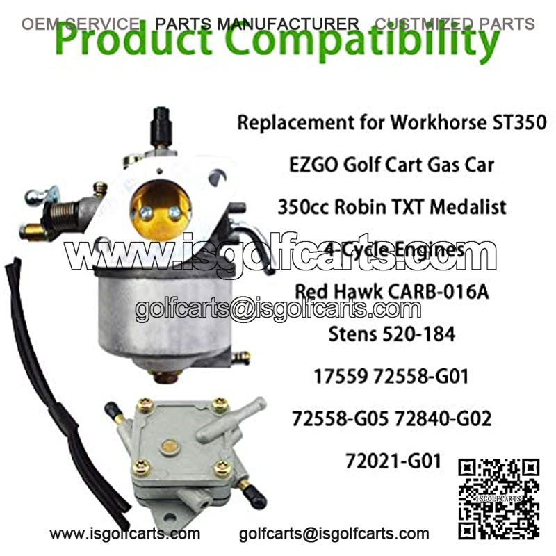 Carburetor with Fuel Pump Replacement for 72021-G01 Workhorse ST350 EZGO Golf Cart Gas Car 350cc Robin TXT Medalist 4-Cycle EnginesReplacement for Red Hawk CARB-016A Stens 520-184 17559 72558-G01 72558-G05 72840-G02 72021-G01Carburetor replacement for EZGO Golf Cart 350cc (Robin) Engines gas club car 4-Cycle TXT Medalist Workhorse ST350 modelsFuel pump replacement for EZGO Golf Carts TXT & Medalist 4-Cycle Models 1994-UP; 295cc & 350cc Robin EnginesReplacement for EZGO gas golf cart models:1999 950 Shuttle Series1994-2003 Pre-MCI 350cc, 4-Cycle engine ST-350, ST-Sport, ST-Sport 2+2, 4- & 6-Passenger Shuttle Carriers1998-2003 Workhorse 12002001-2004 Clays Car, 5-Passenger Cars, 875 & 1200 Industrial vehicles, 1200 Refresher and Oasis Beverage cars, 2200 Cushman Commander2003-2005 MPT 8002003-2008 MPT 12002009 TXT StandardPlease review all product information to ensure that this product is compatible with your unitThe carburetor is made of alloy, which is very durableManufactured to exact measurements to meet or exceed OEM specificationWe provide a lot of accessories for the carburetorIncludes: 1 carburetor, 1 Fuel Pump, 2 fuel lines