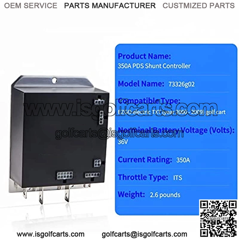 Suggested Application: Fit for EZGO electric TXT (year 2000 – 2009) golf cart as shunt controller working with ITS throttle Superior Integrations: Easy to install and Fit for EZGO 609083, for EZGO 73326g02, 73326g03, 73326g04, 73326g05, 73326g06, 73326g07, FOREPAR 6-230P, for CURTIS 1206MX-1115, and CURTIS 1206MX-4301 golf cart models. Engine Model: 350A 36V TXT Speed Motor Shunt Controller Warranty: If you have any issues regarding the products, our customer care and technical support teams are always available. Note: Please make it very sure that what you plan to buy is applicable in your vehicle. If you are not sure of its suitability, feel free to tell us your controller number and we will help you to confirm.Product Description Key Features Product Name: Shunt Controller for TXT EZGO Shunt Controller Compatible models include EZGO 73326-G03 (73326G03), EZGO 73326-G04 (73326G04), EZGO 73326-G05 (73326G05), EZGO 73326-G06 (73326G06), EZGO 73326-G07 (73326G07), FOREPAR 6-230P, EZGO