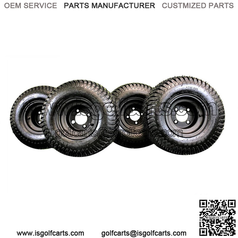 Your order will include: (4) New 18×8.50-8 Golf Cart Turf Tires (comes mounted on the wheels) (4) New 8×7″ Black Steel Golf Cart Wheels Shipped together in a heavy weight corrugated box for added protection.Fits ALL Golf Carts: EZGO: Marathon / Medalist / TXT /ST / PDS / RXV / Workhorse Club Car: DS / CARRYALL / PRECEDENT Yamaha: All G MODELS / DRIVE(G29) Other golf carts: Any bolt pattern that is 4×4 **These assemblies fit any Golf Cart, Lawn Mower, UTV, ATV, or Trailer hub that is 4 bolt and measures 4×4″ (4×101.6mm)**Product DescriptionSet of 4 Tire and Wheel Assemblies *** Wheel Color: Matte Black *** Wheel Size: 8×7 *** Pilot Hole: 2.83″ *** Number of Bolt Holes: 4 *** Bolt Hole Size: .590″ *** Bolt Circle: 4″ *** Offset: Centered *** Tire Size: 18×8.50-8 *** 4 Ply *** Tread Code: ATW-003 *** Non-Directional *** Tire OD: 17.7 Nom *** Tire SW: 8.3 Nom *** PSI: 22 *** Load Rating at 10 mph: 815 lbs..