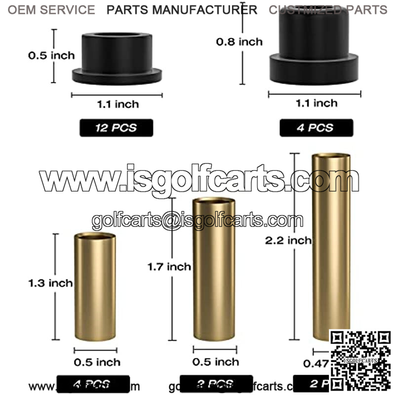 This brand new high quality bushing kit replaces your worn or broken factory bushings.Worn out bushings can often make the golf cart ride rough and not smooth. Premium material sleeve kits.Provide you a smooth and long lasting experience.Complete set of leaf spring bushings,both front and Rear Leaf Springs and Upper suspension shackle bushings and sleeves.High quality long lasting rubber, more durable.