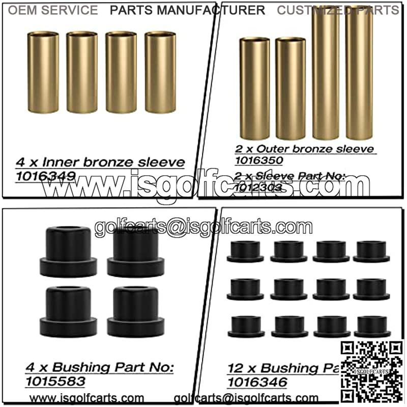 You will get :Complete set of front and rear leaf leaf spring bushings and sleeves.Contains : 4 x Inner bronze sleeve 1016349 ,2 x Outer bronze sleeves 1016350, 2 x Sleeve Part No#:1012303, 4 x Bushing Part No#: 1015583, 12x Urethane bushings 1016346. Club car DS bushings kit supports 365 days warranty. If you have any questions or issues,please do not hesitate to contact us.