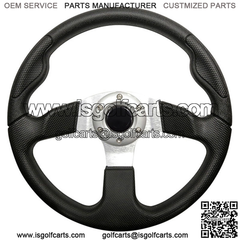 13″ Diameter Custom Steering Wheel. Style: . Color: Black Grip with Brushed Aluminum Spokes. Easy installation on E-Z-Go, Club Car and Yamaha with Custom Adapter (sold separately). Horn button is for aesthetic purposes only. Add a Chrome Adapter (Optional – $25)
