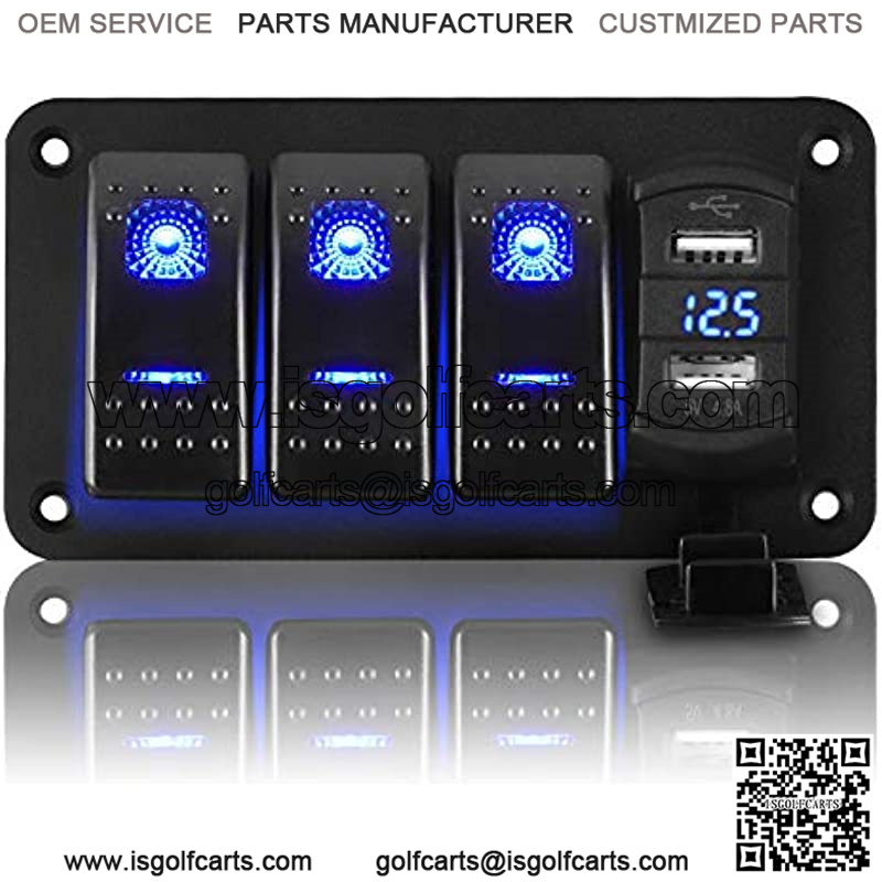 Boat Switch Panel Waterproof, 3 Gang ON Off Toggle Switch Aluminum Panel with 4.8A Dual USB Charger Socket with Blue LED Digital Voltmeter Gauge on Marine, Boat, Car, Golf Cart, UTV, ATV