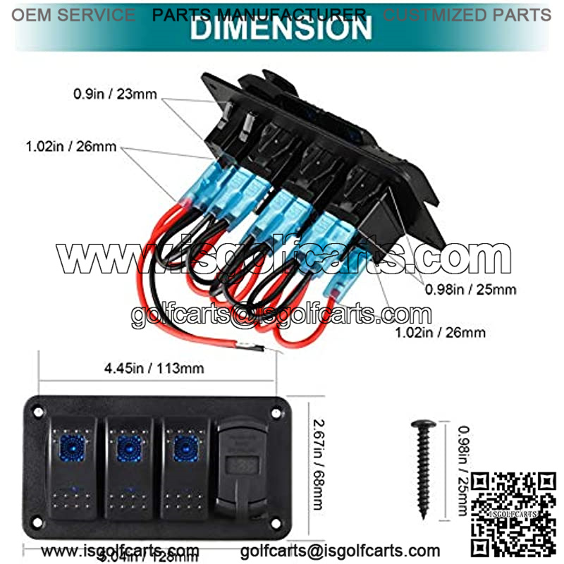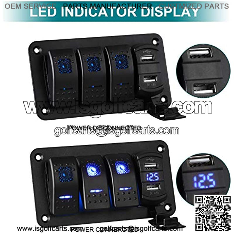 This dual USB rocker fast charger with voltmeter blue aluminum illuminated 3 gang rocker switches are not be signed, can be DIY-used to control any vehicle electrical appliance for your specific need. Sticker can remind you while using.