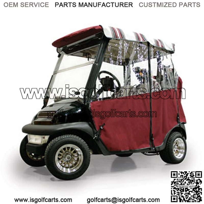Protect your golf cart and your riders with a long-lasting and high quality Sunbrella golf cart enclosure! These Sdard 3-Sided Over-The-Top Enclosures work perfectly with carts that have winhiel and they are a hassle-free way to instly protect your cart.Burgundy/Black/White Valance, Dubonnet Tweed Side PanelFeaturing ‘s patented sleeve-attachment system at the front top supports9.25 -ounce sun-and mildew-resist marine-grade material with double-stitched seamsTriple-laminated, 12-ounce vinyl windowsOur Over-The-Top enclosures easily secure at the bottom with our hook and strap system. A perfect fit all year long!Looking for the matching seat covers We’ve got you covered! For Solid Burgundy For Striped Burgundy/Black/White