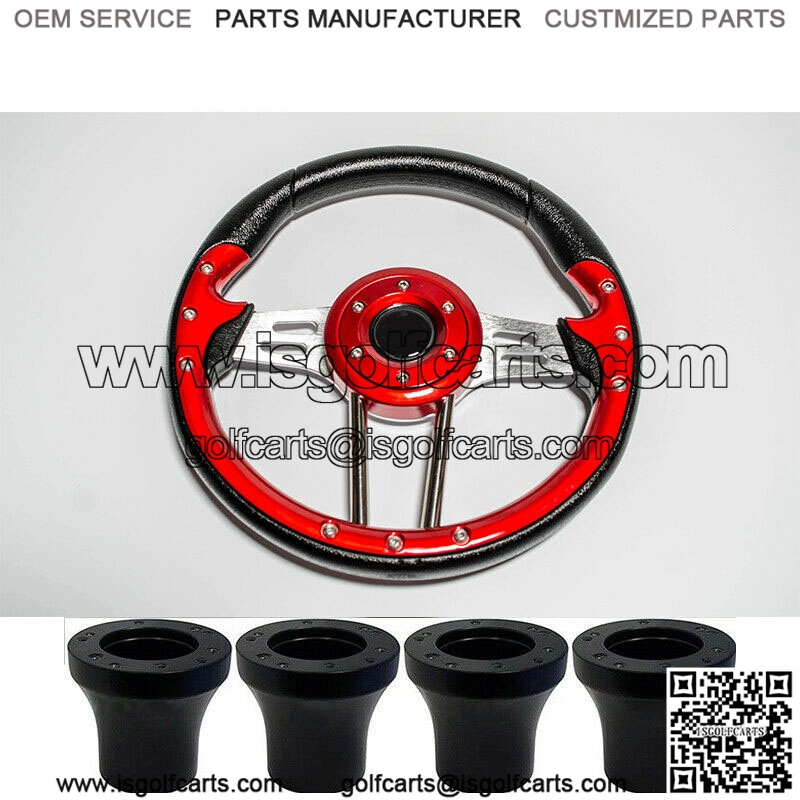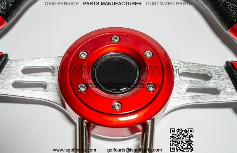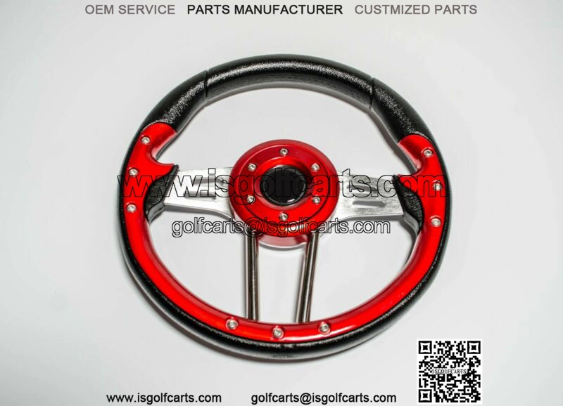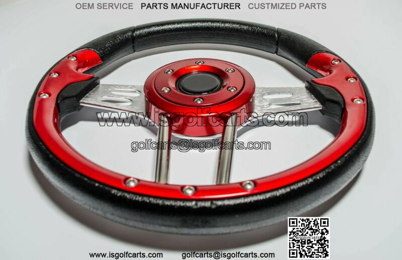 Red Golf Cart Steering Wheel Chrome Spoke Black Adapter For EZGO Club Car YamahaProduct Features:Red Steering Wheel Classic Style W/ Black Hub Adapter For Club Car Precedent/ DS/EZGO/YAMAHA golf cartIf you had a factory steering wheel, you will need a cart specific adapter to install this aftermarket steering wheel, which is included in this listing.Super good looking red grip steering wheel w/ brushed aluminum spokes and logo.It has a polyurethane grip with extra urethane coating for better heat resistance and longer life.Easy Installation. It comes with step by step installation instructions.Please double check your cart model before purchasing. If you have any question, please feel free to message us.Thank you for your business.