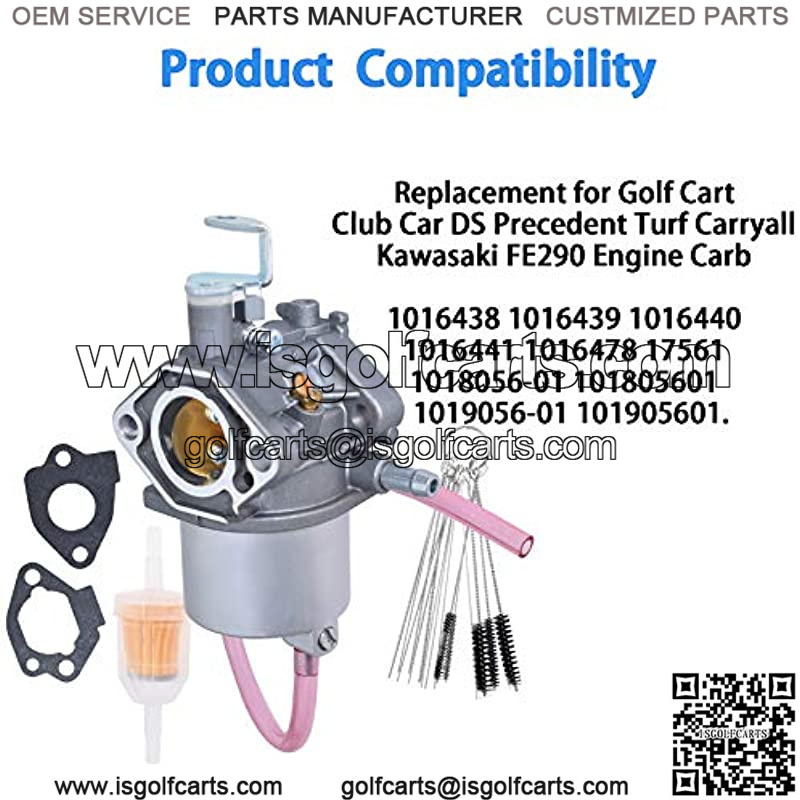 Carburetor Replacement for Golf Cart, Club Car, DS Precedent, Turf and Carryall, Kawasaki FE290 engine.Specifications:Material: alloy.Replacement for Golf Cart, Club Car, DS Precedent, Turf, and Carryall.Replacement for Club Car DS Precedent models 1998-UP FE290 engines.Replacement for part number:1016438, 1016439, 1016440, 1016441, 1016478, 17561,1018056-01, 101805601, 1019056-01, 101905601.Package Include:1 x carburetor,1 x carburetor cleaning brush,1 x fuel line,1 x fuel filter,2 x mount gaskets.Note:Please verify this is the right part number before ordering.