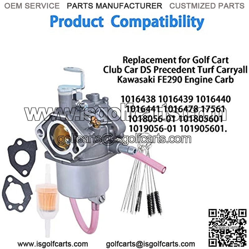 Carburetor Replacement for Golf Cart, Club Car, DS Precedent, Turf and Carryall, Kawasaki FE290 engine.Specifications:Material: alloy.Replacement for Golf Cart, Club Car, DS Precedent, Turf, and Carryall.Replacement for Club Car DS Precedent models 1998-UP FE290 engines.Replacement for part number:1016438, 1016439, 1016440, 1016441, 1016478, 17561,1018056-01, 101805601, 1019056-01, 101905601.Package Include:1 x carburetor,1 x carburetor cleaning brush,1 x fuel line,1 x fuel filter,2 x mount gaskets.Note:Please verify this is the right part