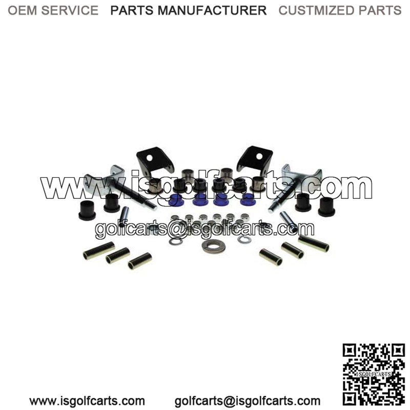 Front end repair kit with hardware. For Club Car DS G&E 1993-Up. Includes all Front End Control Arm Bushings and Sleeves, Front Leaf Spring Bushings and Sleeves, Both Clevis, All King Pin Bushings, and Both Front King Pins with Washers and Nuts.