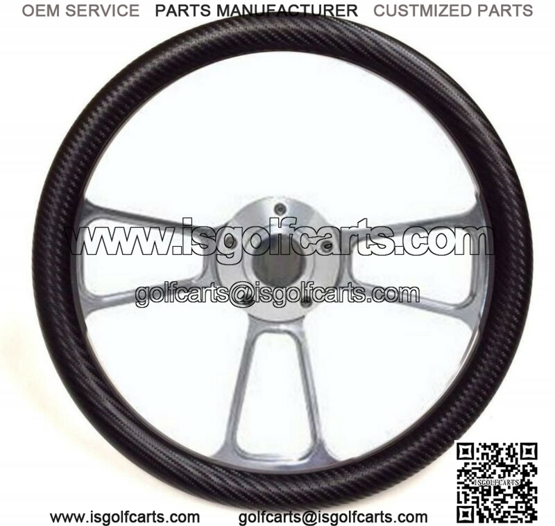 14″ Billet Aluminum with Black Carbon Fiber Vinyl Half Wrap Steering Wheel for Golf Carts Includes Horn and Adapter Part: 1098F-CFV-ET56P Behind The Wheel Features Smooth Finger Grooves For Added Grip Sleek Design! – Dimensions (approx): 3.5″ OD x 2.25″ Tall – Dish Depth of approx. 2″ – Polished Horn Button w/ Installation Wires – Full Billet One Piece Installation AdapterThis Kit will fit: EZGO Golf Carts (ALL) Club Car (1983 and prior) Bombardier Golf Carts GEM Golf Carts Harley Davidson (thru 1982) Columbia Par Cars (1982 and prior) Artic Cat Prowler Polaris Ranger (1998 and onwards) Polaris RZR (2008 and onwards) E-merge and Anvil (2005 and onwards)
