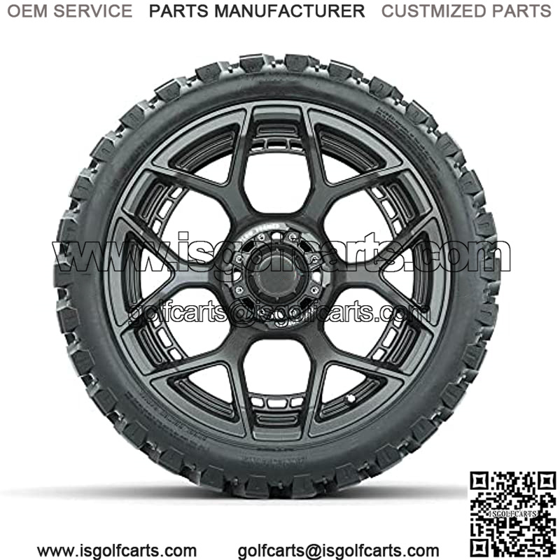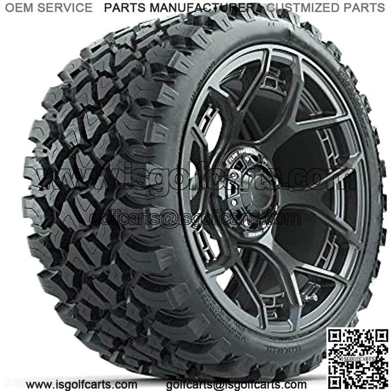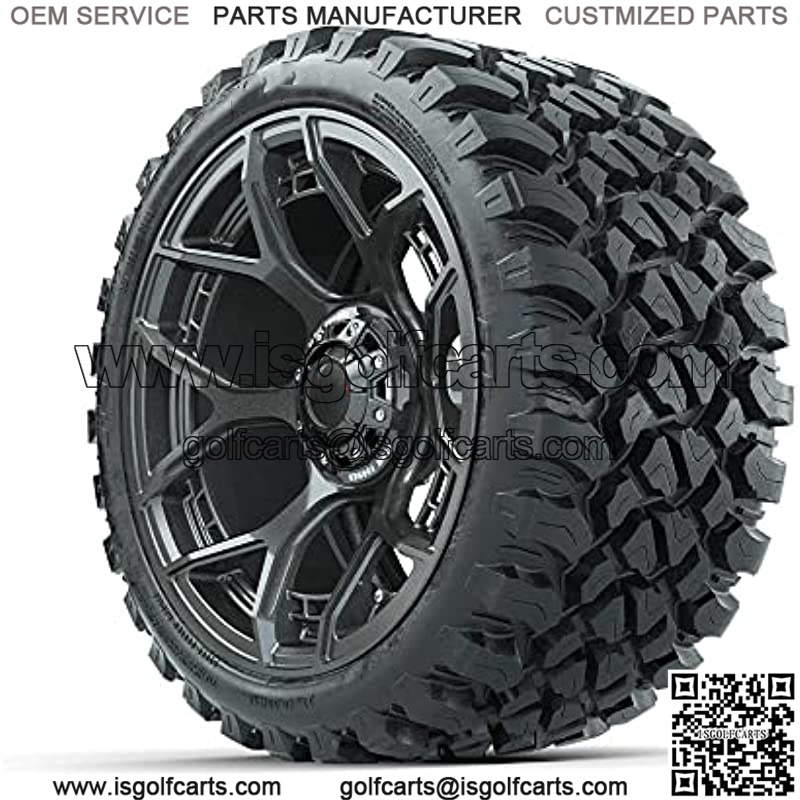 Evolution Gunmetal 15″ Lifted Golf Cart Wheels Mounted on 23″ Steel Belted Radial All-Terrain Tires (23×10-15) | Set of 4