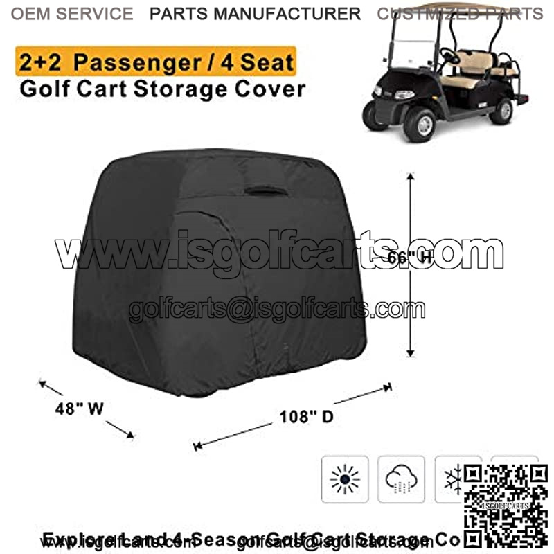 4 passenger golf cart cover size: 108L x 48 W x66H inch. Universal cover fits for most brand four-person golf cart, such as Yamaha, Honda, Club Car, EZGO.