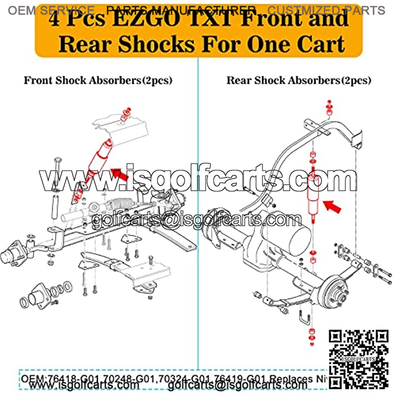 EZGO TXT Shock Front and Rear Shock Absorbers Replaces OEM #76418-G01, 70248-G01, 70324-G01, 76419-G01, Replaces Nivel #5006., All bushings are included.