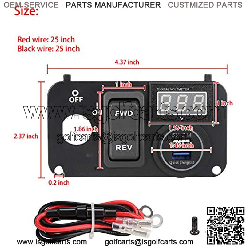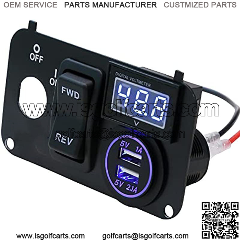 Golf Cart 3 in 1 multifunctional Integrated Panel,Dual USB Charger Socket + LED Digital Voltmeter + Forward Reverse Switch Button Panel Size: 4.37″(L)* 2.37″(W) Perfect Fit for EZGO TXT Golf Carts All needed hardwares and connection wires are included,easy to install DIY Panel Content: 1xDigital LED Voltmeter Volt Meter Battery Gauge DC 15-120V wide voltage display; 1×2.4A+3.0A USB Fast Charger/ Dual USB Ports DC 12V input,Waterproof & Dustproof, over-current, over-charging protection, more safer for normal use; And this dual USB charger power socket also smart to identify the most appropriate current for your device, ensure the longer lifetime of the battery and engine; 1xGolf Cart Forward Reverse Switch Assembly for EZGO TXT ,Replaces OEM part#: EZGO 74323G01 74323-G01