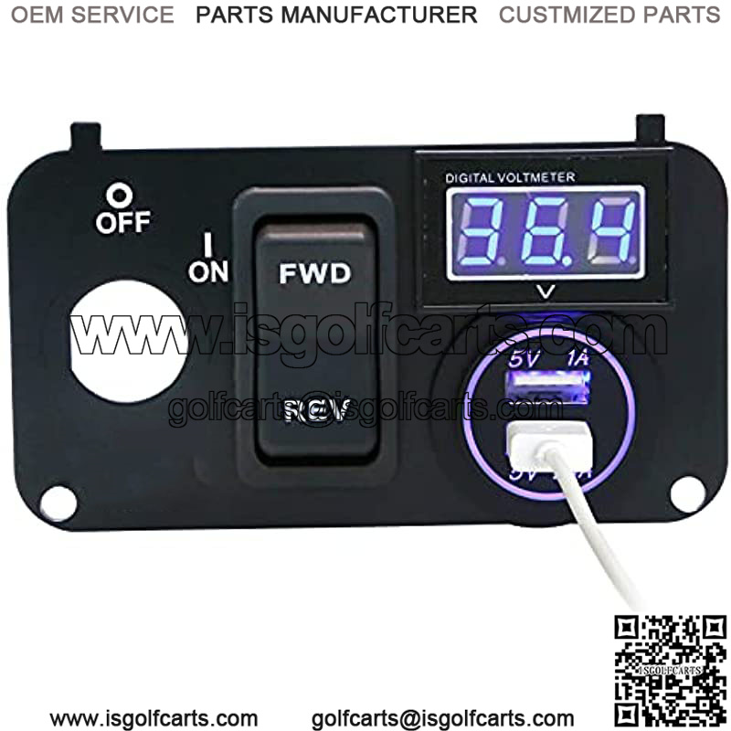 ????Designed & Improved 3 in 1 Socket Panel ????,Fit for EZGO TXT&PDS Golf Carts,easy to install and operate. Also detachable to replace other charger sockets or anything else that fits; ????3.0 Quick Charge Dual USB Charger Socket????: This DC 12V,2.4A+3.1A USB socket is built-in dual USB charging ports, could simultaneously charging 2 electronic devices at optimal speed??NOTE:Input voltage must be 12V??; ????Real-Time LED Voltmeter???? :This switch panel for Golf Carts with large digital voltmeter display that shows DC 15-120V voltage, you can monitor the condition of the battery on your golf cart if the voltage is under normal status; ????EZGO Forward Reverse Switch????: For EZGO TXT PDS Golf Carts, Years 2003 & Up, OEM part#: EZGO 74323G01 74323-G01 .(It will not work on DCS or series drive system golf carts); ????Package Include????: 1x Aluminum alloy Panel,1 x Dual USB Charger Ports ,1 x F&R Switch, 1 x Digital Volt Meter.