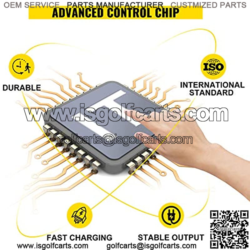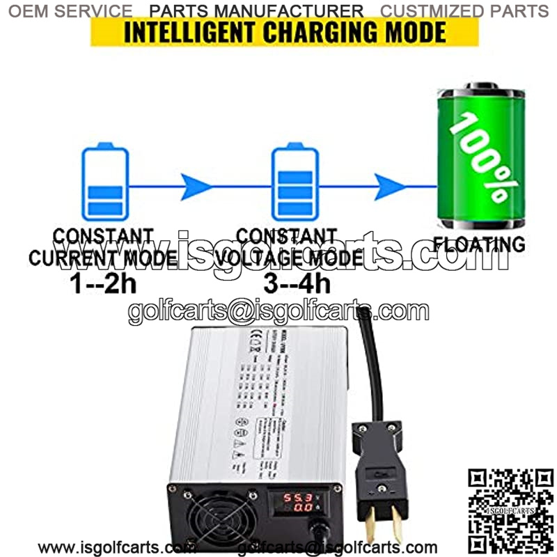 Sturdy Shell & Cooling Fan The golf cart charger is made of aluminum alloy material, which has a high strength to resist compression and deformation. A built-in cooling fan effectively reduces the operating heat. Extra wire protective casing protects the power cord well.