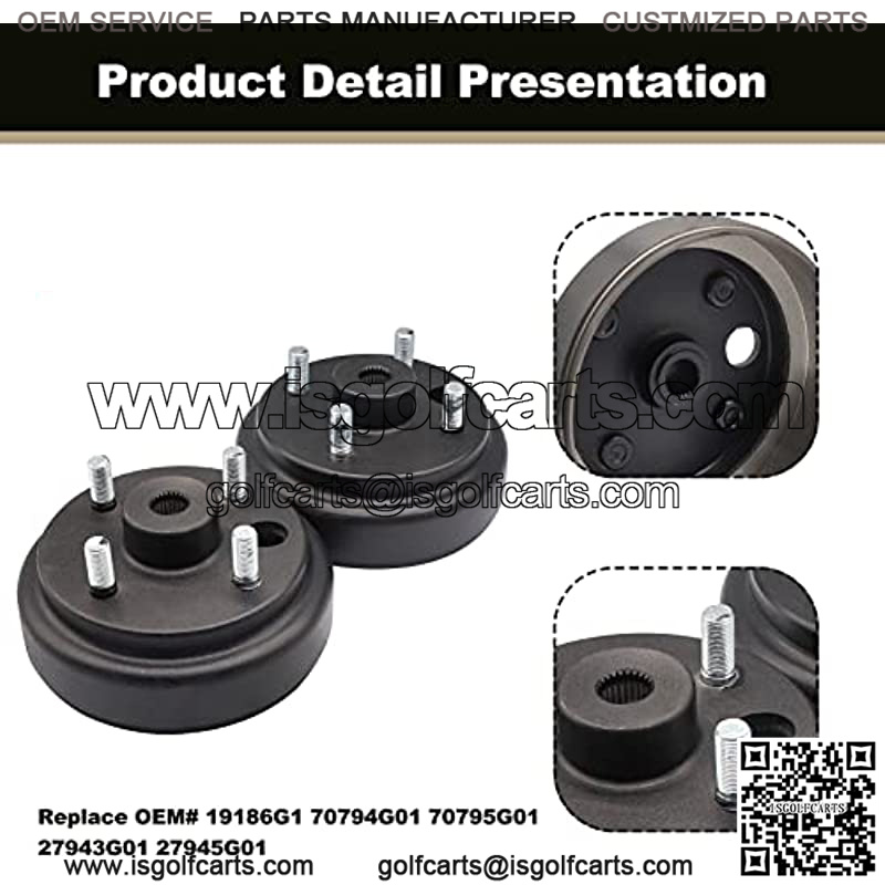 ??All-inclusive kit to complete your EZGO golf cart’s brake job: 2 Pieces Brake Drums are held in place by a castellated nut (5/8-Inch x 18tpi) and a thick (.118-Inch) flat washer.(This hub/drum is a replacement for the earlier (before 1982) hub & drum andhas the star spline instead of the straight key.Has a 3/4-Inch center hole with a 24-tooth star spline.) Replaces OEM#: 19186-G1