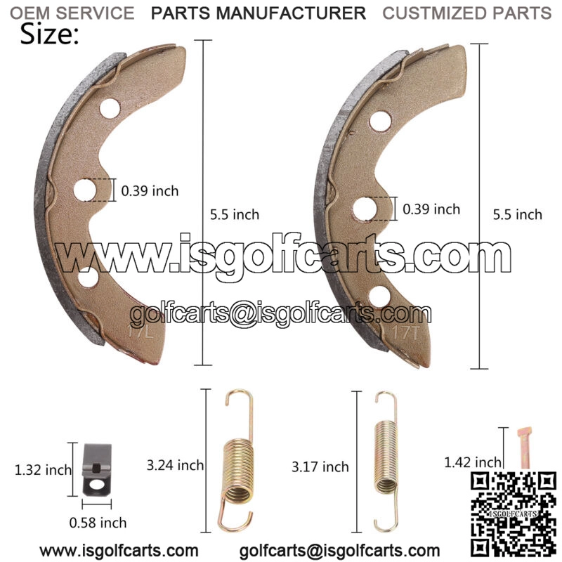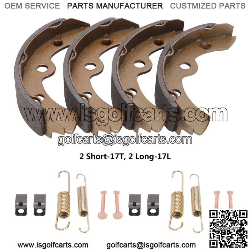 Golf CartBrake Shoes& Spring Kit for Club Car DS1995-up,Precedent 2004-up- Golf Cart brake shoes & spring kit contains 4 brake shoes (2 short, 2 long) and 2 sets spring kits for two brake drums;- This Golf Cart parts accessories fit for Club Car DS 1995-up, Precedent 2004-up gas and electric carts. – Club Car brake shoes spring set replaces OEM: 1018232-01;1018163-01, 1011466.Aftermarket Reference #4324, 4333, 5162, 5219- Easy to install : When install the shoe stamped ??17T?? needs to be toward the front of cart and ??17L??to the rear.- Perfect replacement part to solve your carts brake grabbing.