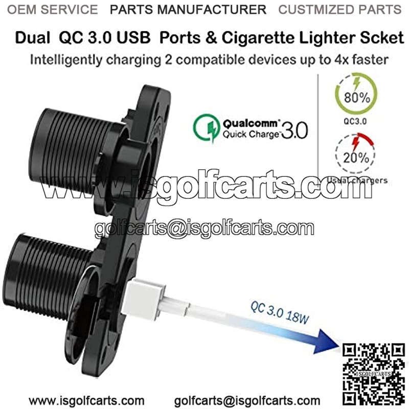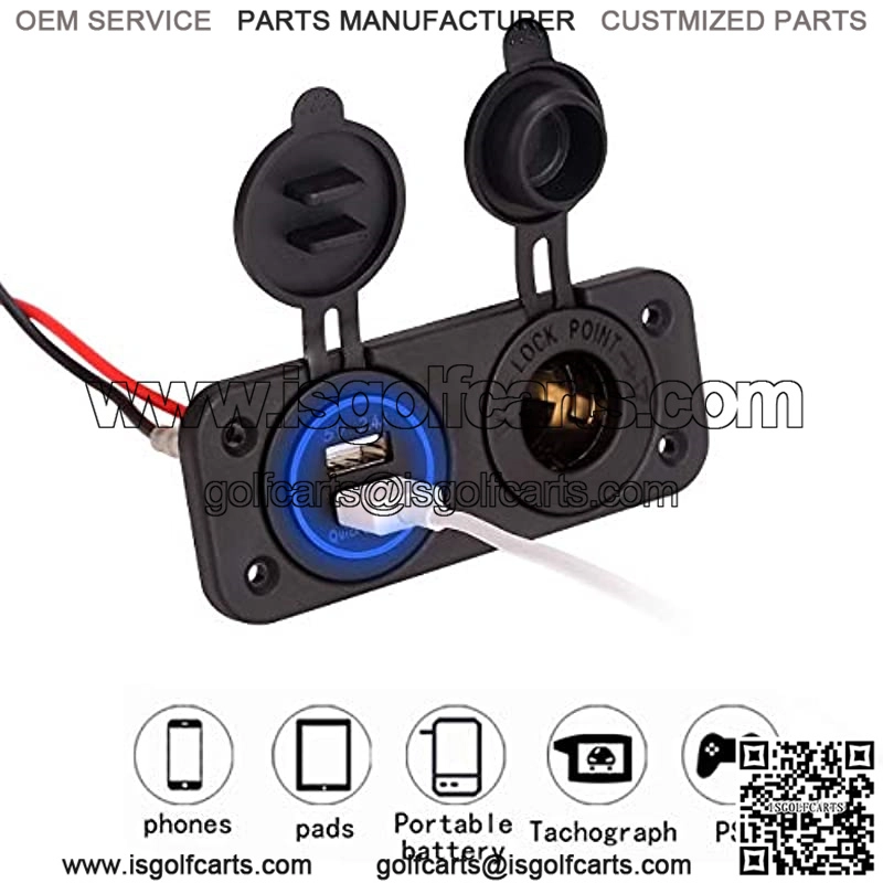 Golf Cart QC 3.0 Dual USB Charger with Cigarette Lighter Outlet, Universal For EZGO Club Car YAMAHA Models; 2 USB Charging Ports:one Quick Charge 3.0 USB port,one 2.4 A big output port,enables to charge 2 devices simultaneously. Built-in smart chip will intelligently detect your devices and charging devices at optimal current; This USB charger sockets fits for 12 VOL input golf carts; Cigarette Lighter Socket could power up to 150W (24V). Enough for everyday use, fits perfectly with different electric devices; Tested strictly,with Over-load, Over-current and Short Circuit Protection to ensure charging safety; Meanwhile, IP66 waterproof grade, offer long time usage; Blue LED indicator light, shows clearly the charing process at night or in dark place,very convinent. Note: the blue led light only shows up when connected to power.Golf Cart QC 3.0 Dual USB Charger/Port+Cigarette Lighter Outlet, Universal For EZGO Club Car YAMAHA Golf Carts DC 12V/24VGreat addition to your g