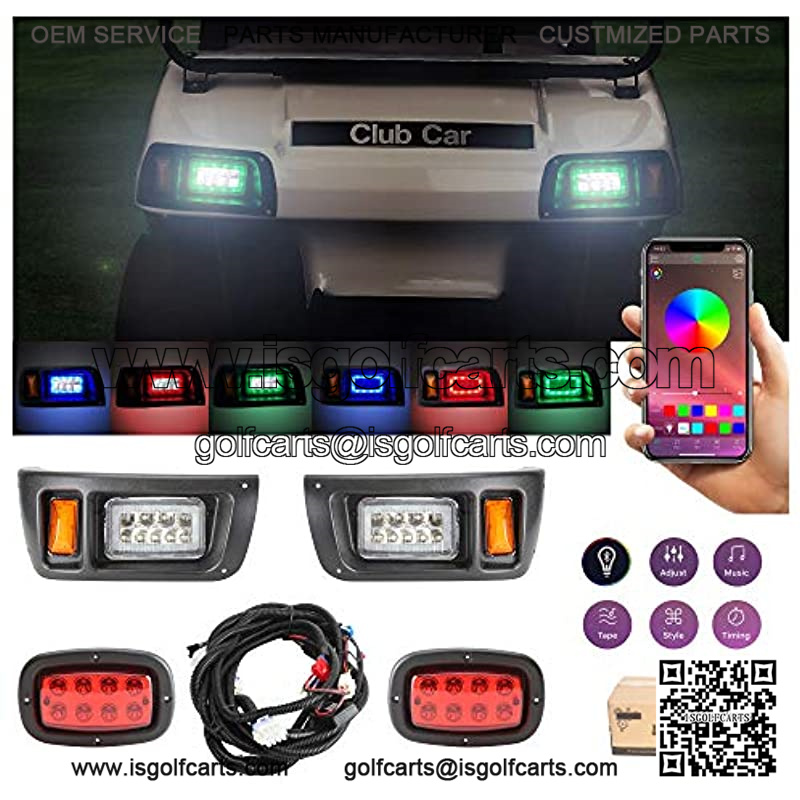 Golf Cart Deluxe LED Light Kit for with RGB Headlight Daytime Running Light Low High Beam Turn Signal Function1.This complete light kit Provide you bright vision in night. 2.Make you more safty in fog or rainy day when driving outdoor for headlight with Daytime Running Lamp. 3.The DRL with multi-colorful mode controlled by music after down load App in our user manual.Application: The latest LED headlight and tail light kit fits Club Car DS gas and electric golf cart Warm reminder: Input voltage 12V-80V (connect to the battery directly, no voltage reducer needed)Package include: 2x LED headlights, 2x LED Tail lights, 1x Harness, 1x universal light upgrade kit with turn signals switch horn brake pad switch Harness