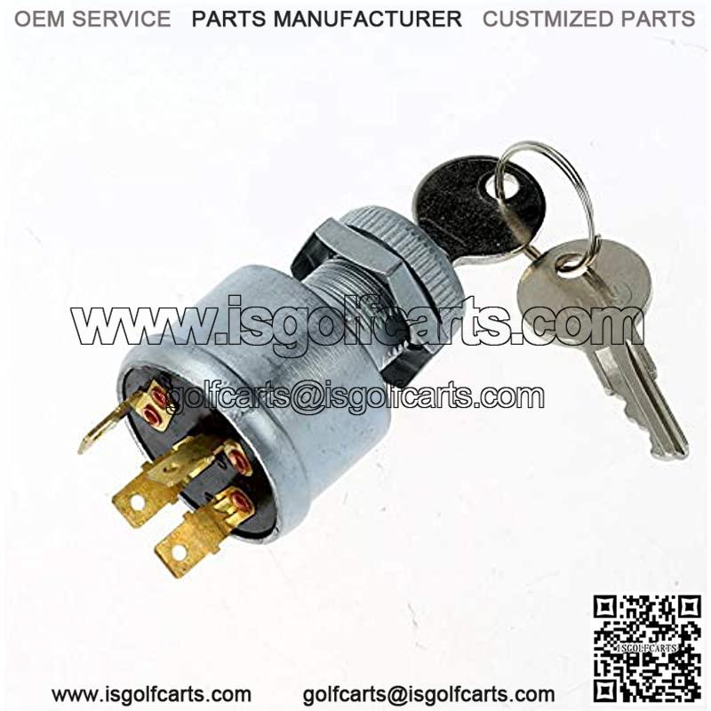 Ignition switch for EZGO is a 3-way, 4-terminal OFF-ON-Lights/Accessories-ON ignition switch that contains 2 standard keys